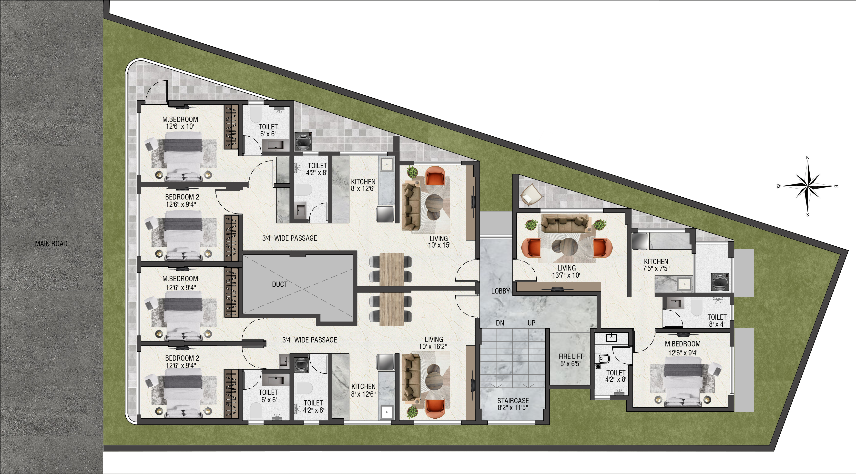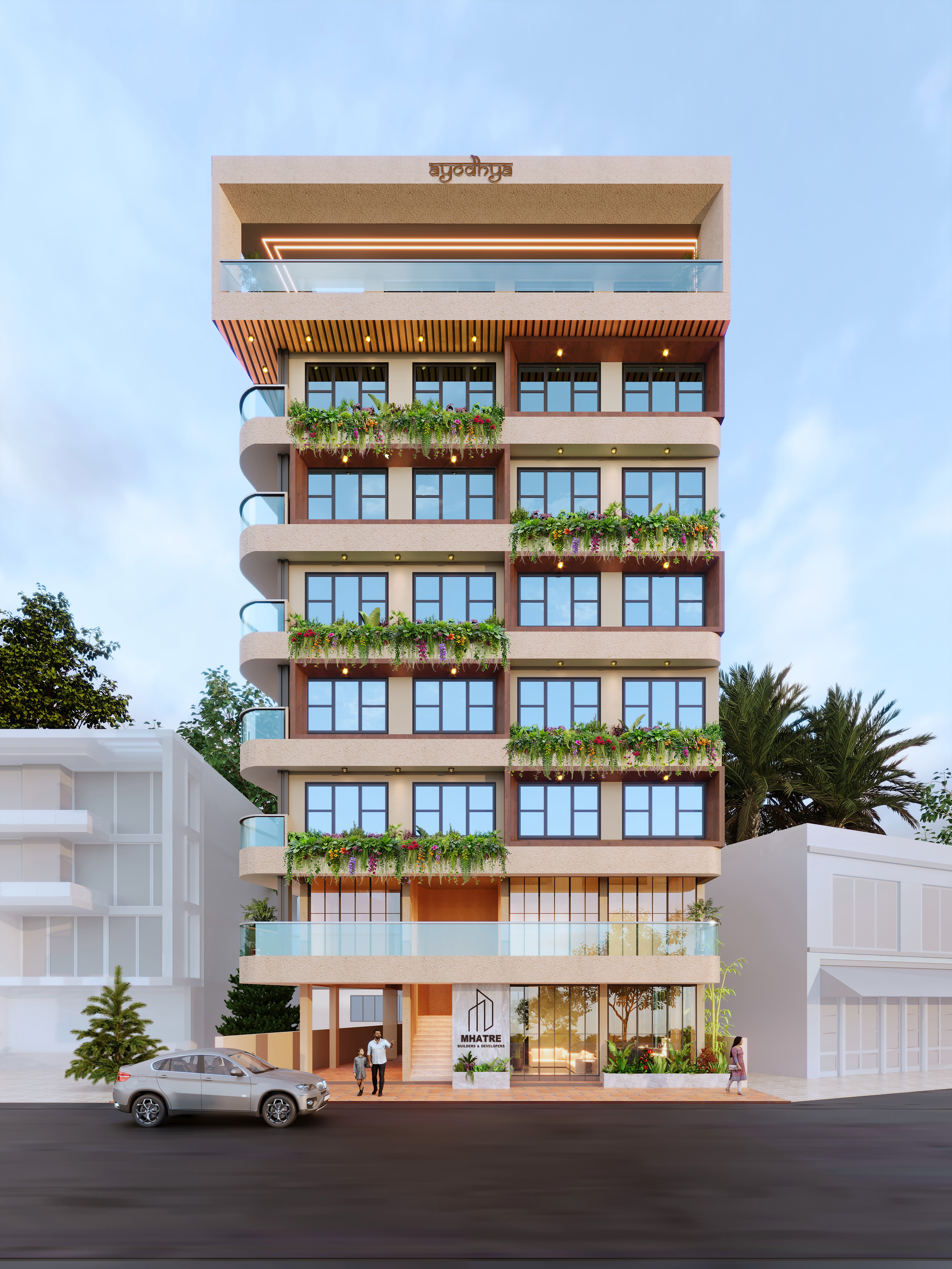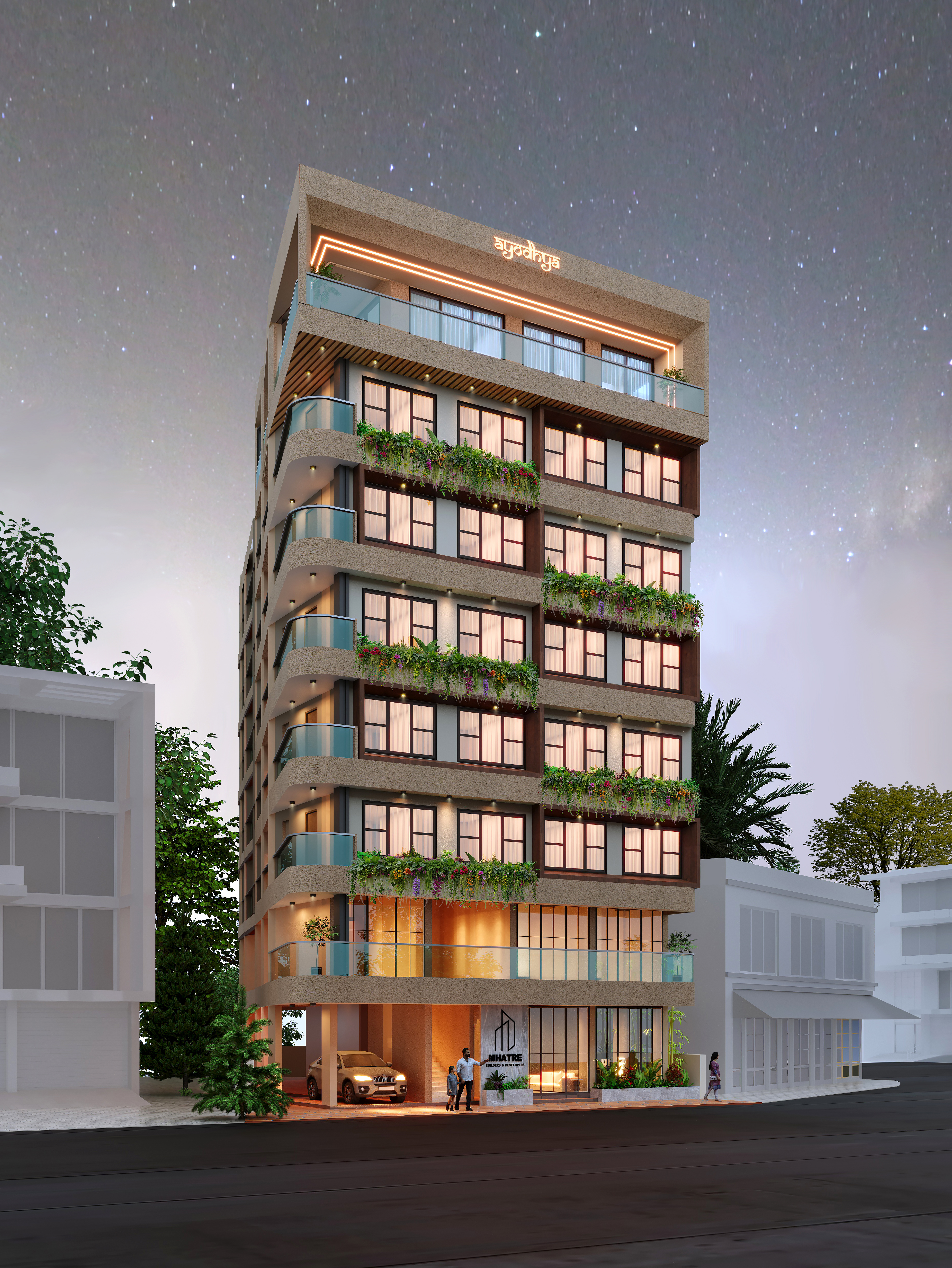 Ayodhya is a modern, elegantly designed residential building that blends contemporary architecture with warm, inviting aesthetics. Featuring spacious balconies, lush green planters on every floor, and soft ambient lighting, Ayodhya offers a tranquil yet upscale living experience. The property includes a grand entrance lobby, secure parking, and thoughtfully crafted living spaces—perfect for families seeking comfort, style, and a premium urban lifestyle.